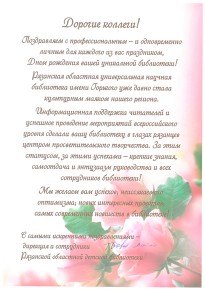Высокая оценка деятельности библиотеки прозвучала в выступлениях вице-губернатора – первого заместителя председателя Правительства Рязанской области С.В. Филимонова, депутата областной Думы Т.Н. Панфиловой, первого заместителя министра культуры и туризма Рязанской области М.В. Горожановой, министра образования Рязанской области О.С. Щетинкиной, заместителя министра по делам территориальных образований и общественных объединений Рязанской области В.Н. Коробкина, заместителя директора областной детской библиотеки С.С. Вайло, директора областной специальной библиотеки для слепых О.А. Луневой, председателя миссионерского отдела Рязанской епархии, протоиерея Арсения Вилкова, руководителей национальных общественных объединений.