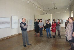 Сначала мы познакомились с выставкой произведений народного художника России Виктора Минкина «Свете тихий». Она приурочена к 70-летию автора. Виктор Алексеевич рассказал о себе и своем творчестве. В 1967 он поступил в Ленинградский институт живописи, скульптуры и архитектуры имени И.Е. Репина, с 1973 года работает в Рязани. Творчество Виктора Минкина сложно и многогранно. Он работает в разных жанрах – пейзаже, портрете, натюрморте. Его работы находятся во многих музеях нашей страны, в том числе в Третьяковской галерее и Русском музее.